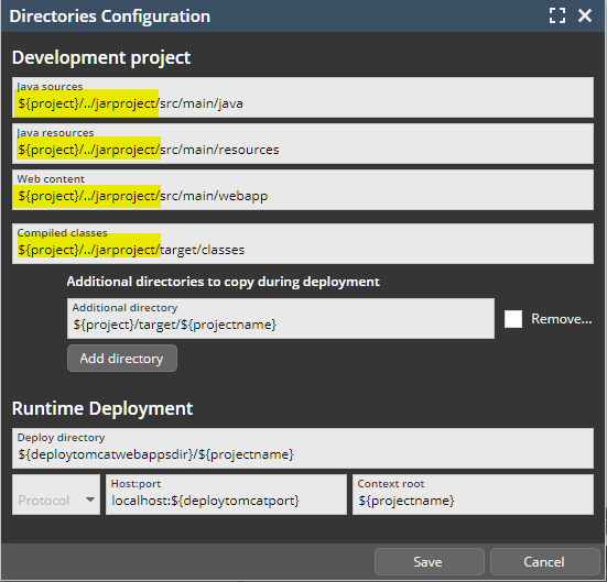 The directories for keeping the sources, the resources and layouts is not the .war-project but the .jar-project! So adapt these four values to point to the .jar-project. Assuming that both projects reside in the same workspace directory, you may use “../” inside the definition and do not have to define absolute directory names.