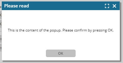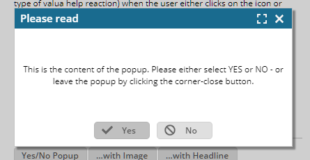 Inside the text you can define active elements: in the example above there is a link calling some JavaScript function at the end to reload the current screen. - Please note: you cannot add any “<script>...</script>” sequence! If you want to refer to explicit JavaScript coding then you have to add it by extending the client with an own JavaScript library (see documentation “Developer’s Guide – RISC Addons”).