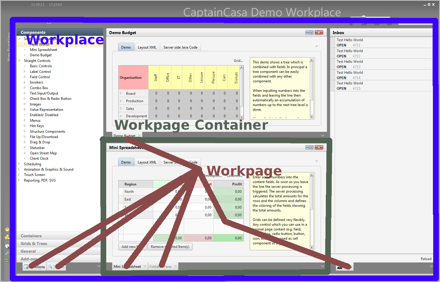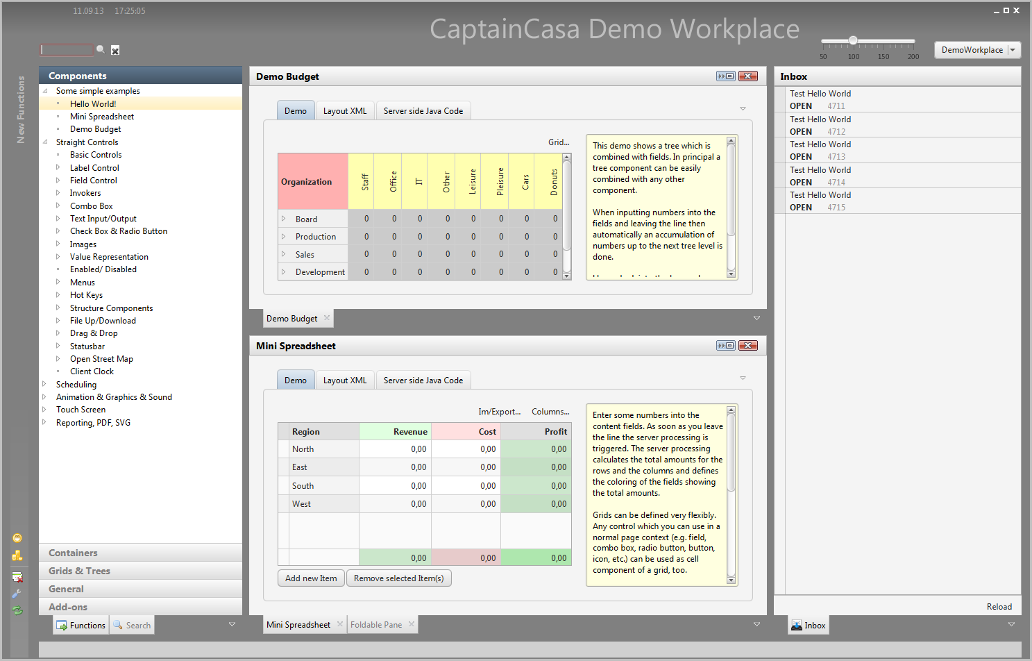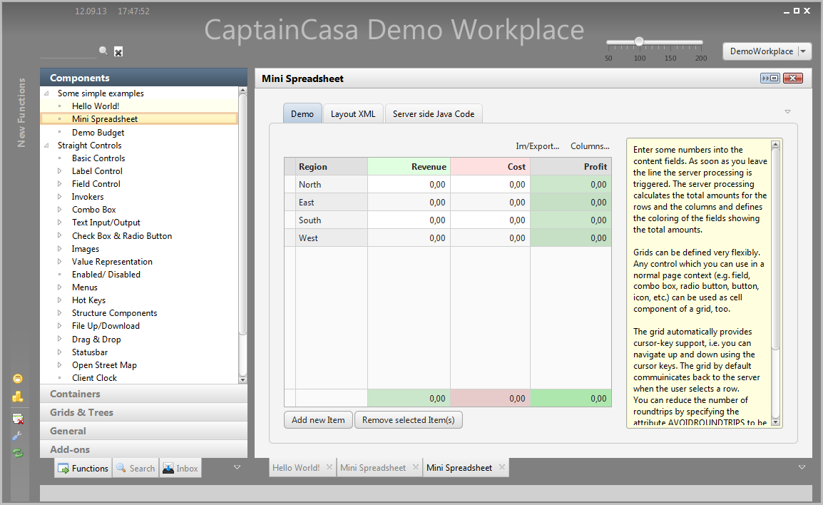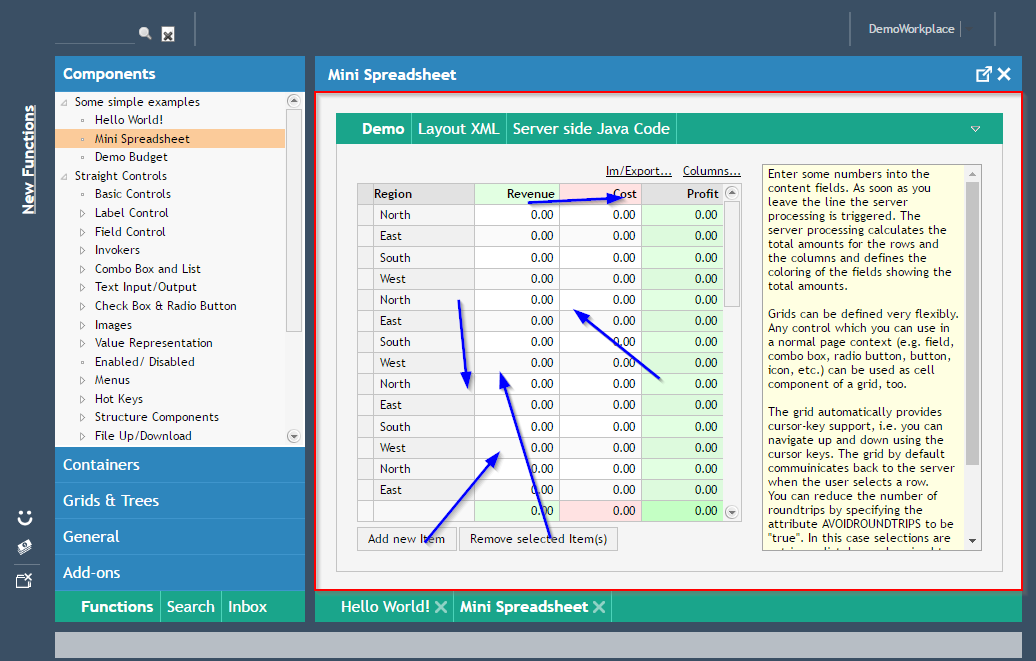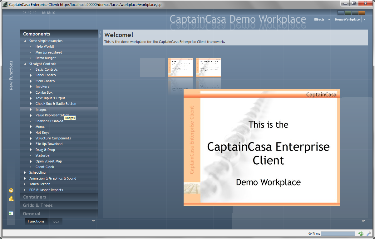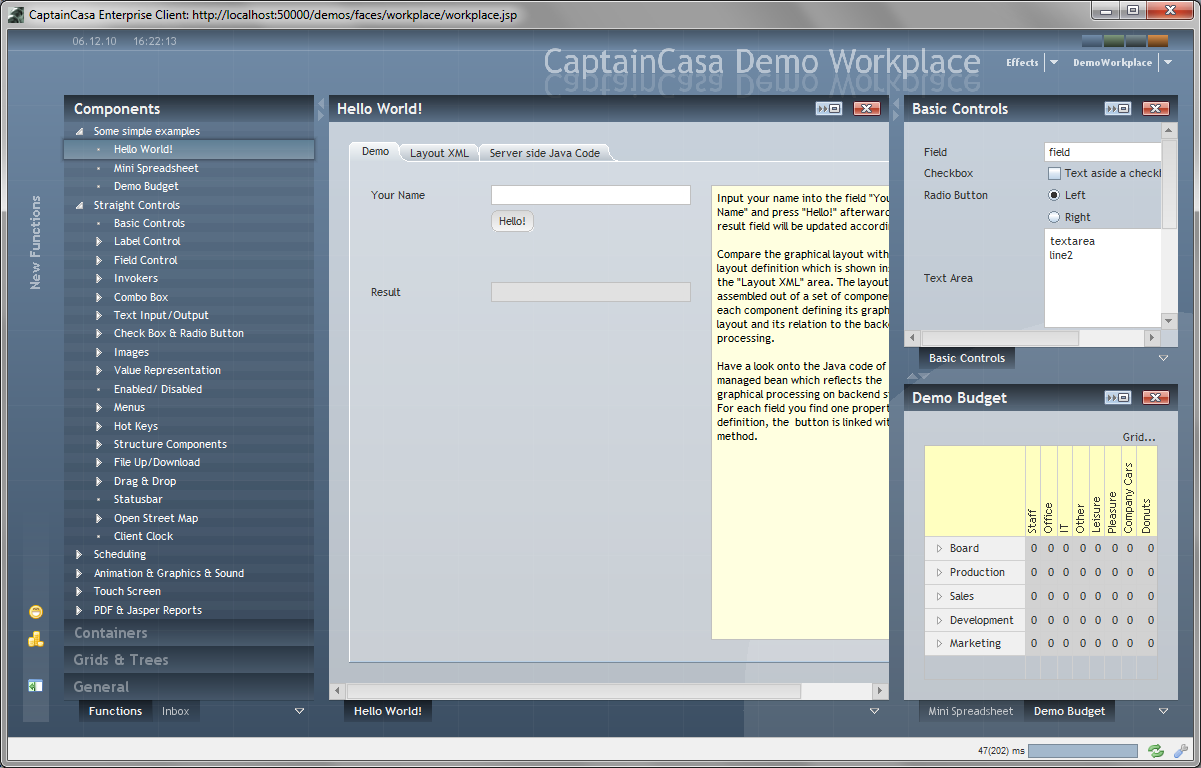 Please note that there are a couple of examples that are delivered with the Enterprise Client Installation. Open the “Demo Workplace” to view the examples. For every control there is at least one example showing how to use it. The demo web application contains all the Java source files (“workplacesrc” directory) and all the JSP files (“workplace” directory)