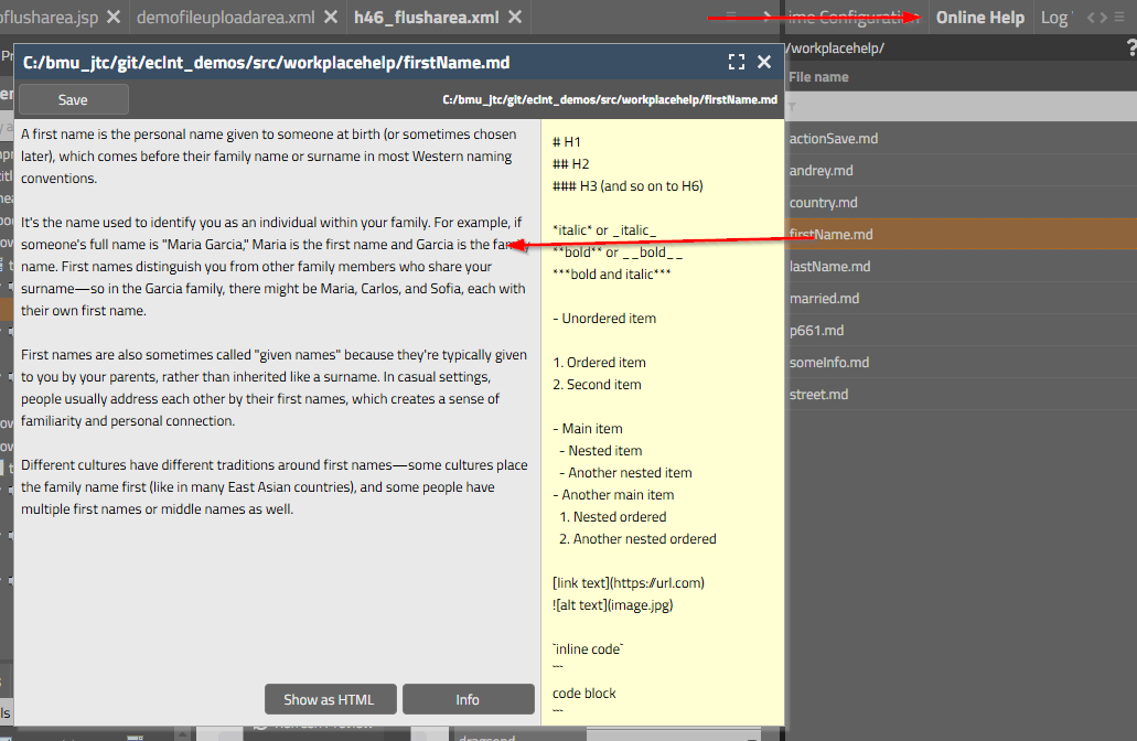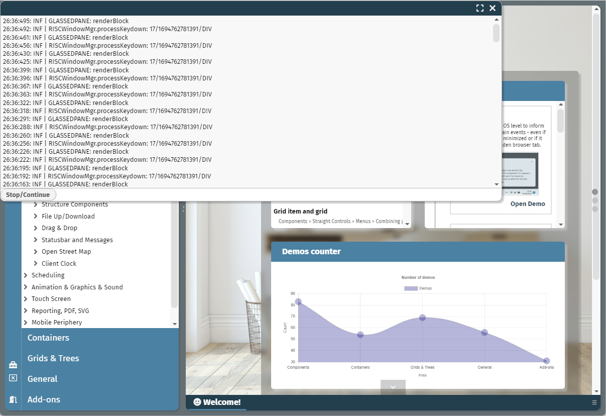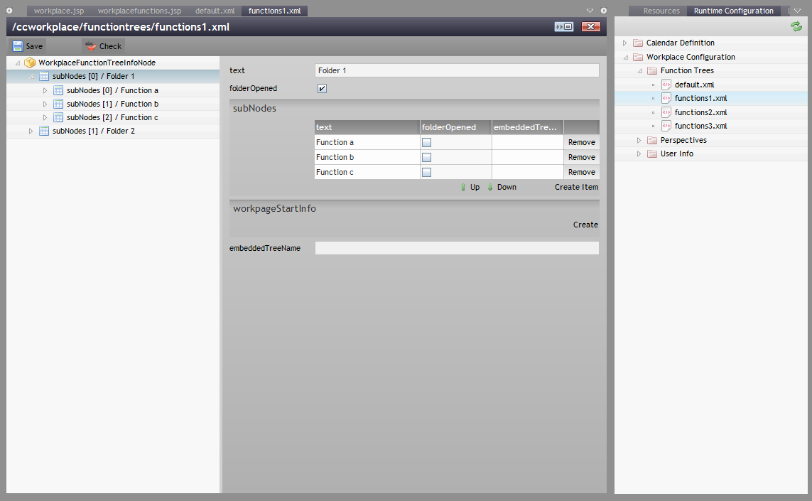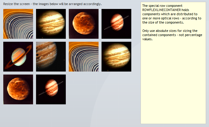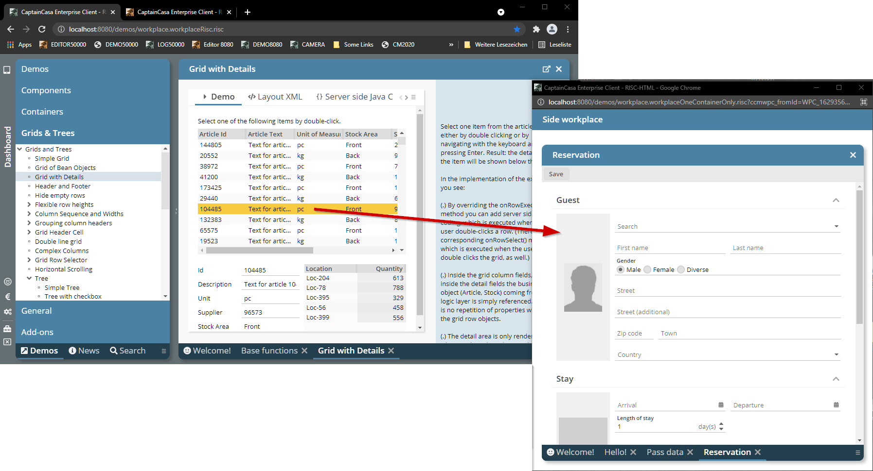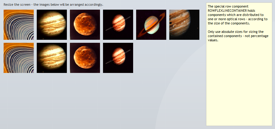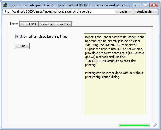 Please note that there are a couple of examples that are delivered with the Enterprise Client Installation. Open the “Demo Workplace” to view the examples. For every control there is at least one example showing how to use it. The demo web application contains all the Java source files (“workplacesrc” directory) and all the JSP files (“workplace” directory)